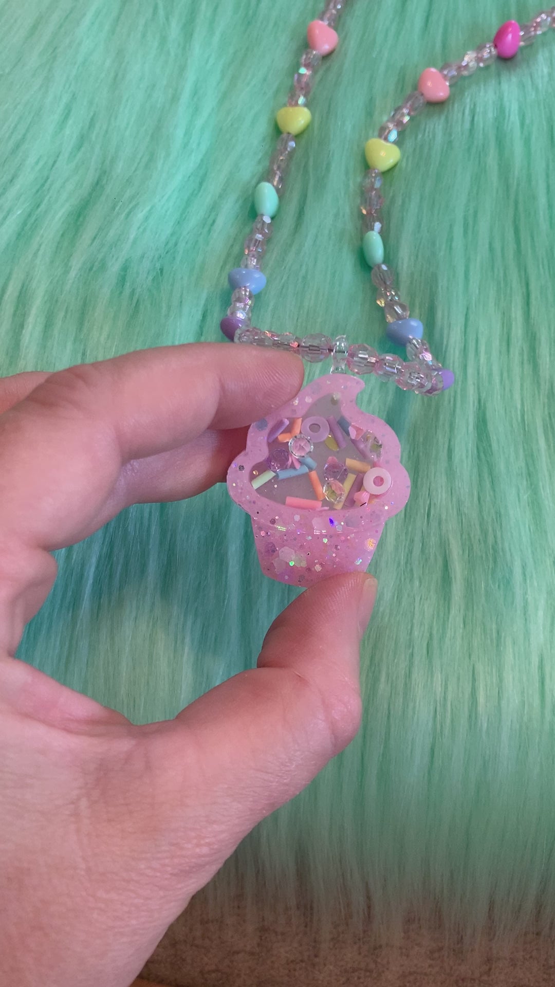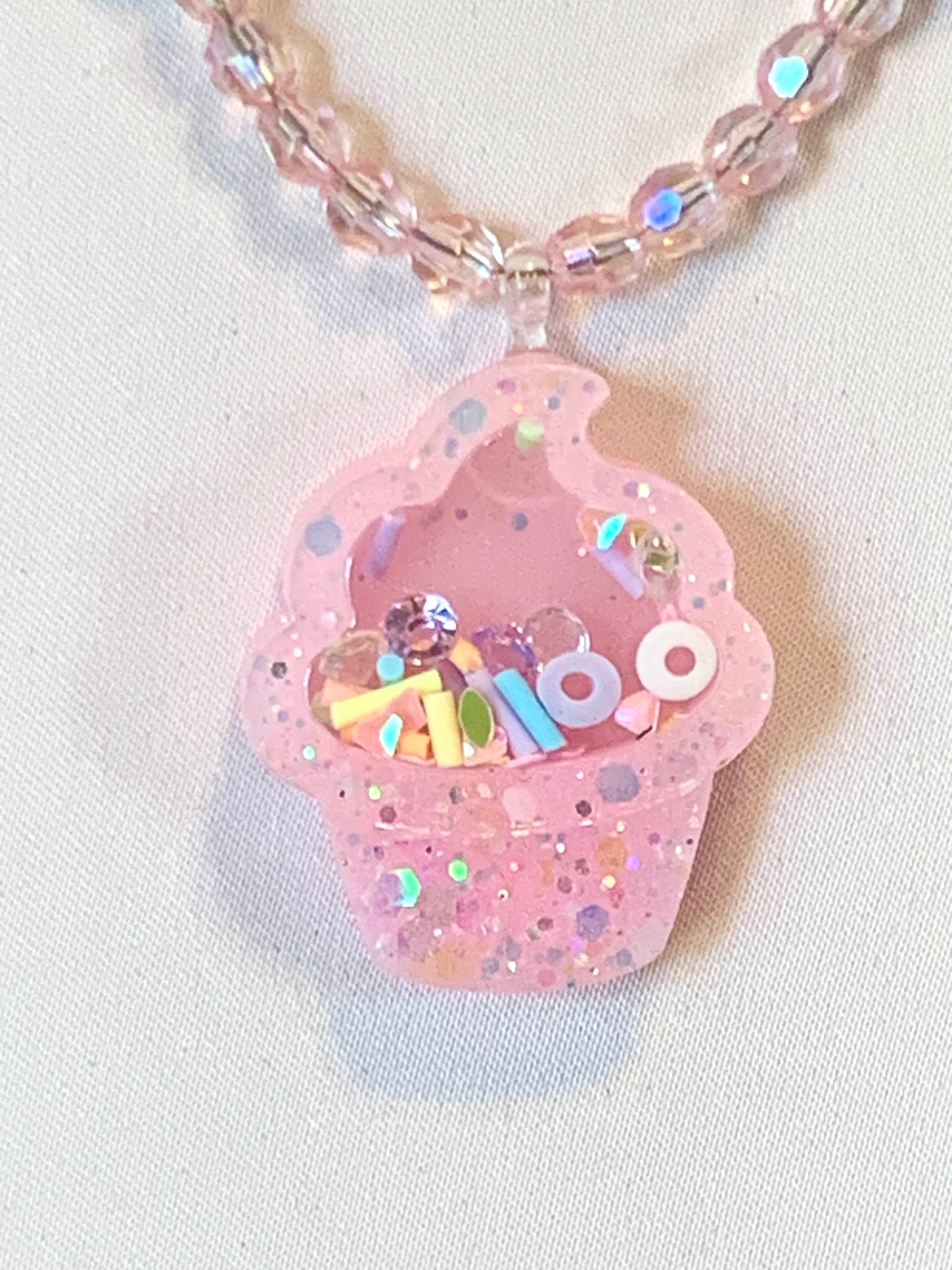 One of a kind, handmade, pink Kawaii resin cupcake with glow-in-the-dark glitter. Inside of shaker is pastel rainbow sprinkles and pastel rhinestones. Necklace has pink iridescent beads with pastel rainbow hearts. This necklace has a silver clasp, and does not stretch.