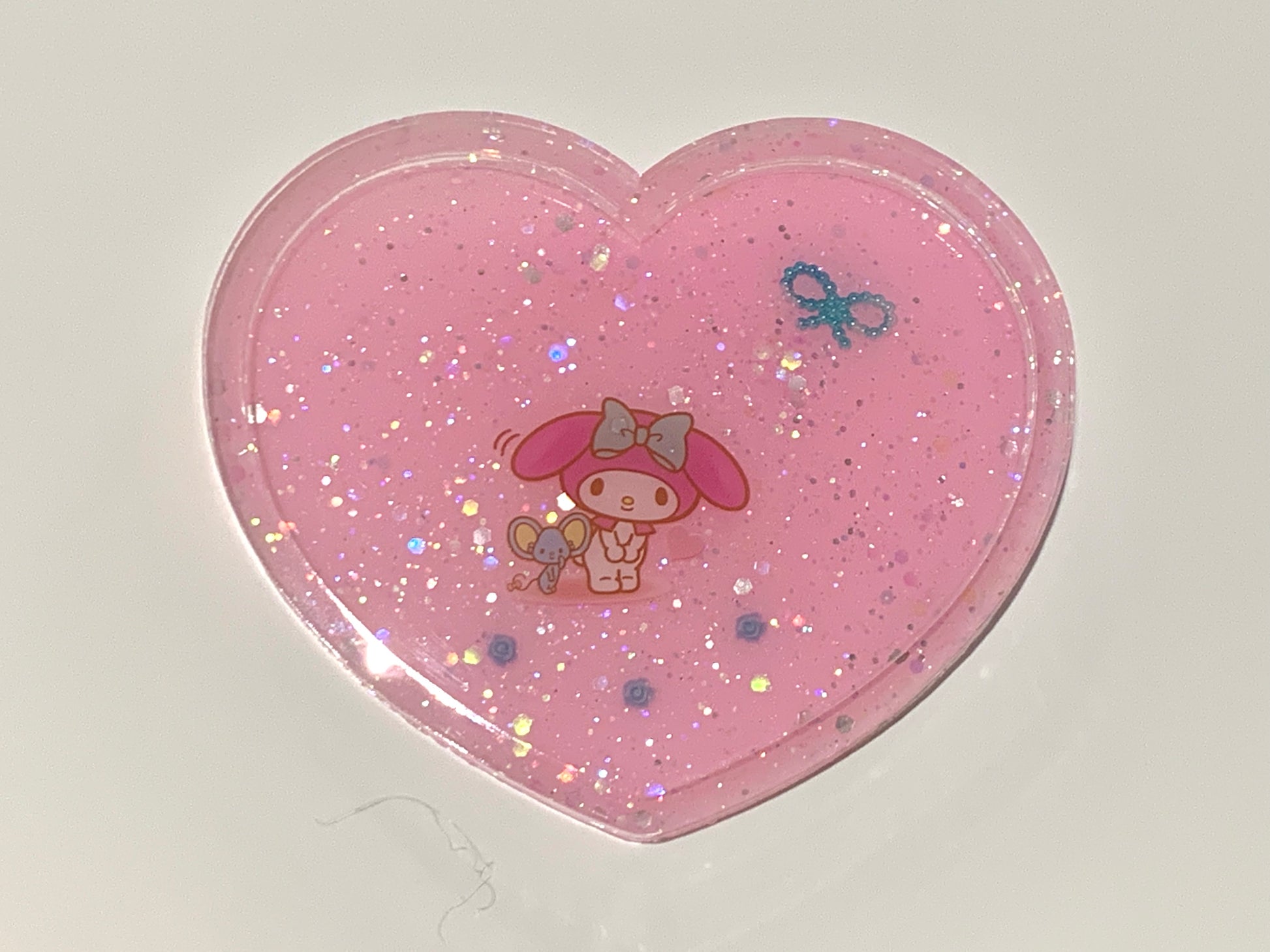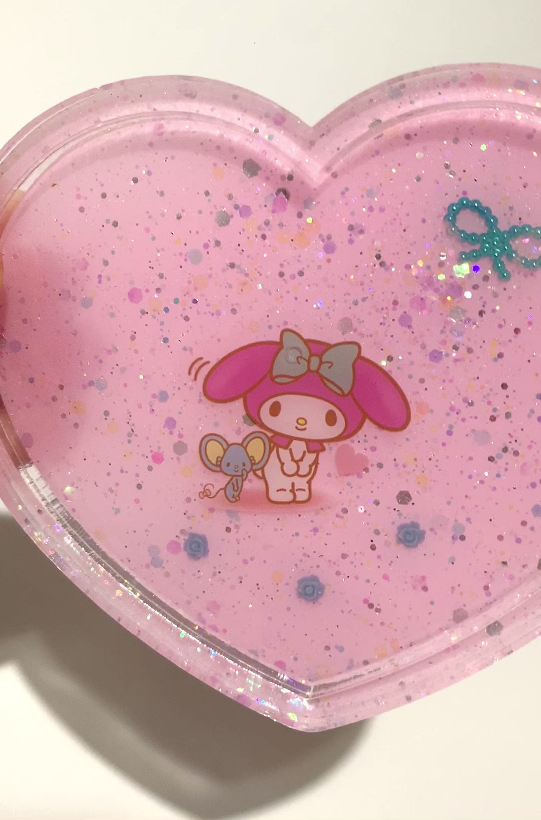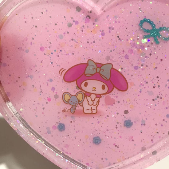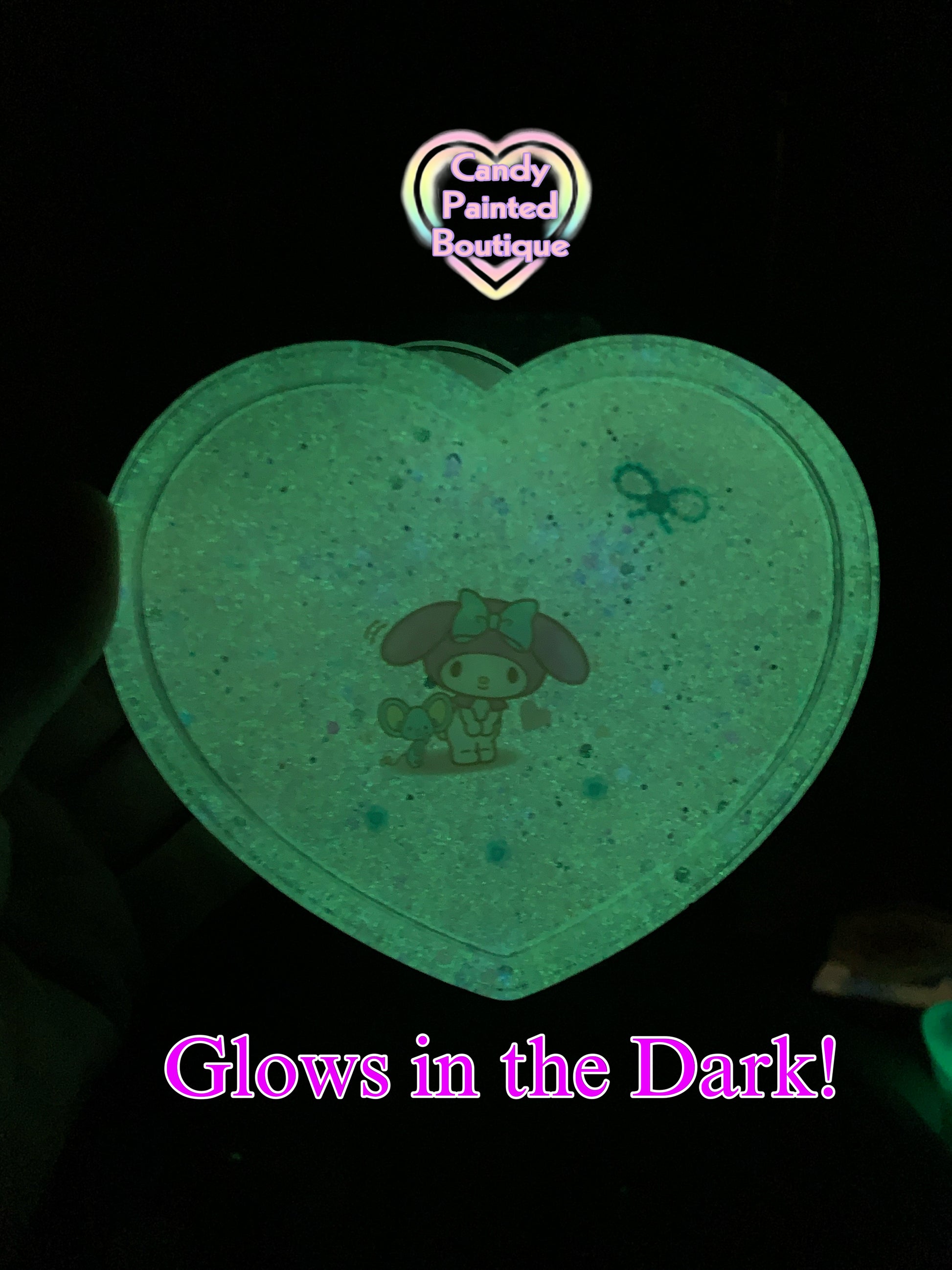 This sweet Kawaii bunny is with her little mouse friend in this beautiful pastel pink heart tray. Three blue roses are underneath them, and a blue bow in the top right corner. There is beautiful chunky glow in the dark glitter in the background. The sun, or any light can charge the tray to glow, but the fastest way is by blacklight.