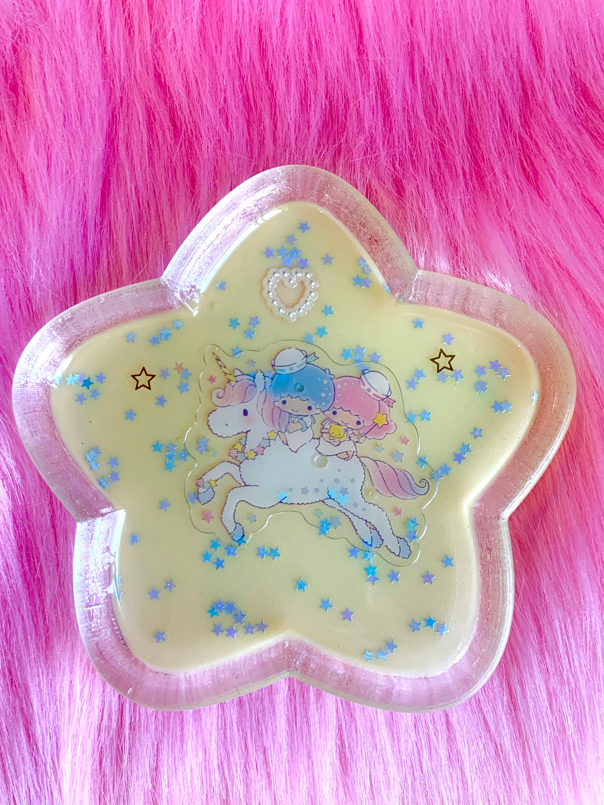 This is a pastel yellow heart tray featuring two Kawaii characters on a unicorn. There are blue holographic star flakes throughout.