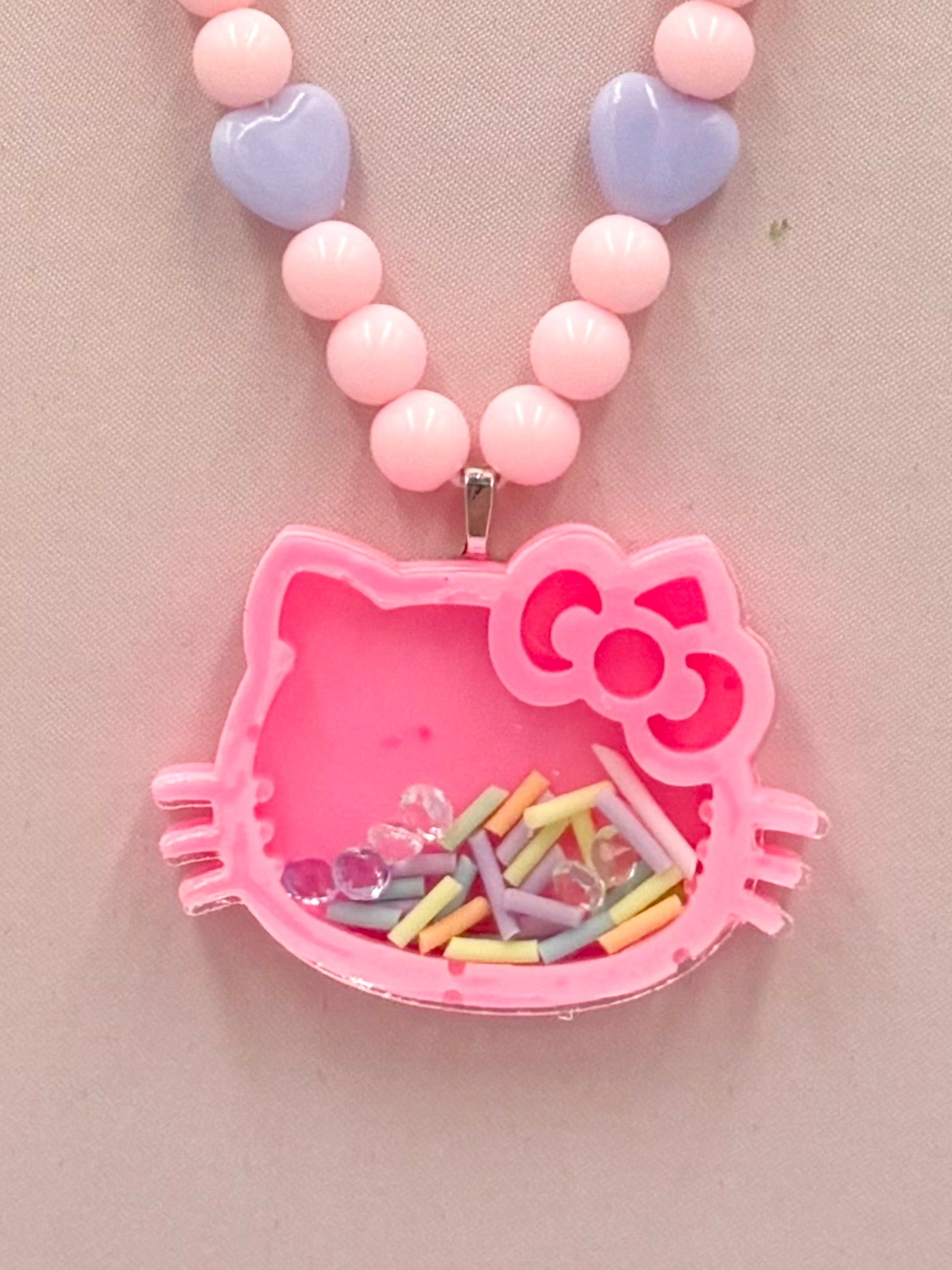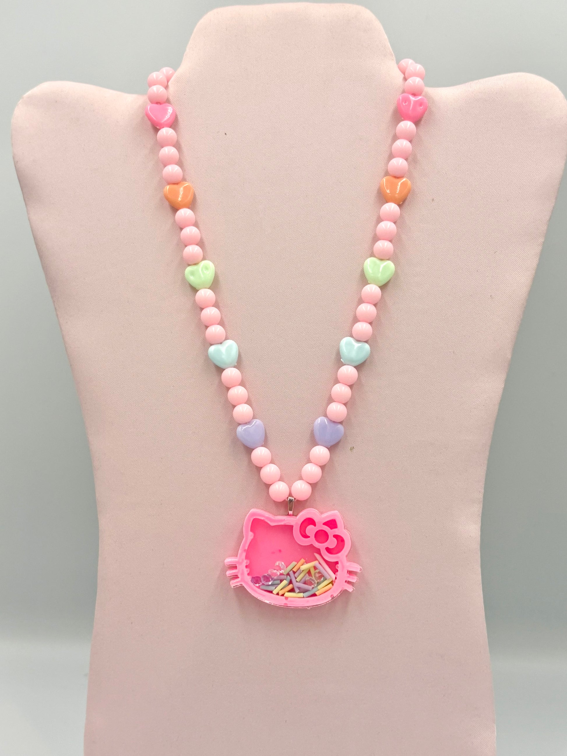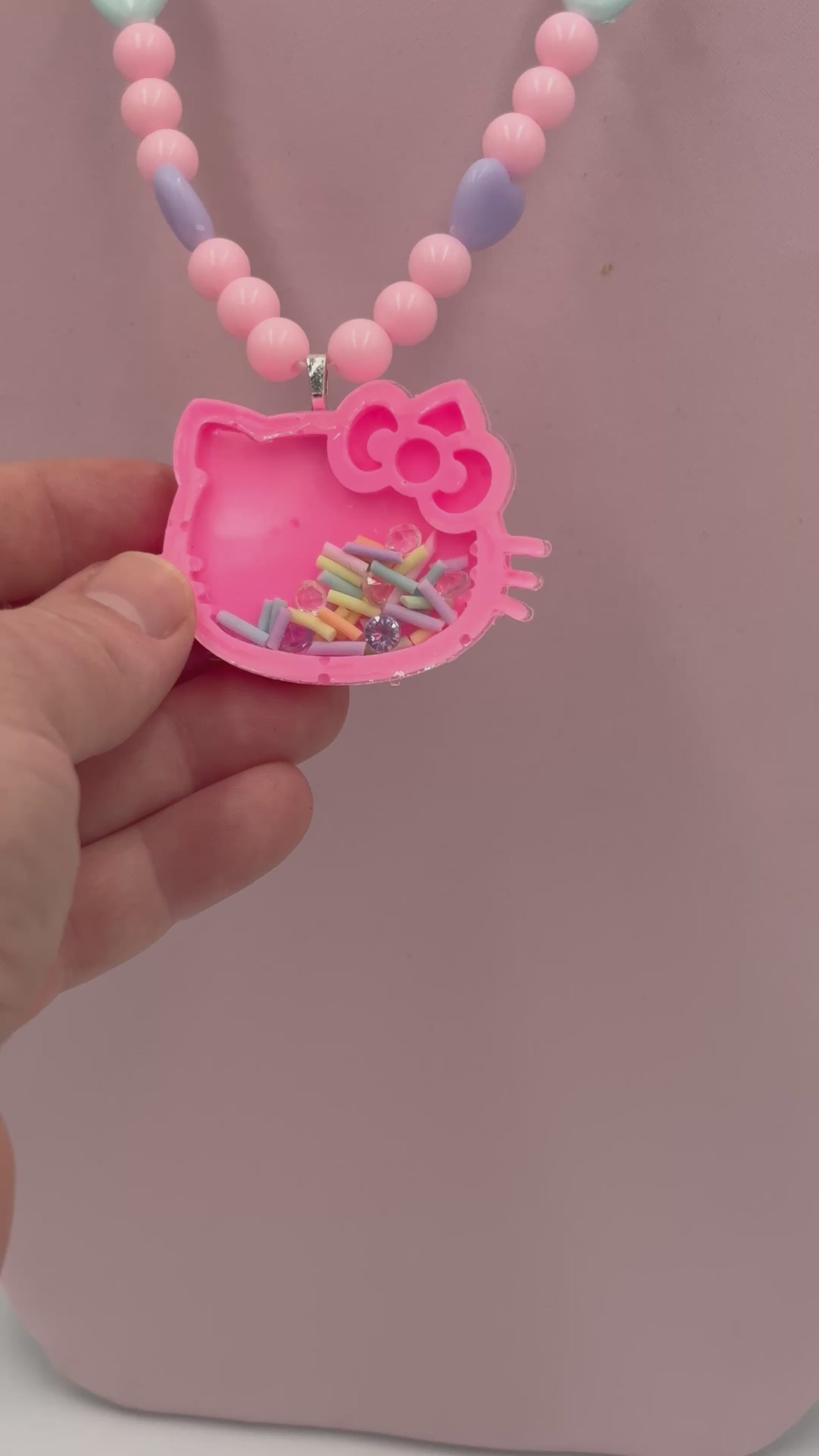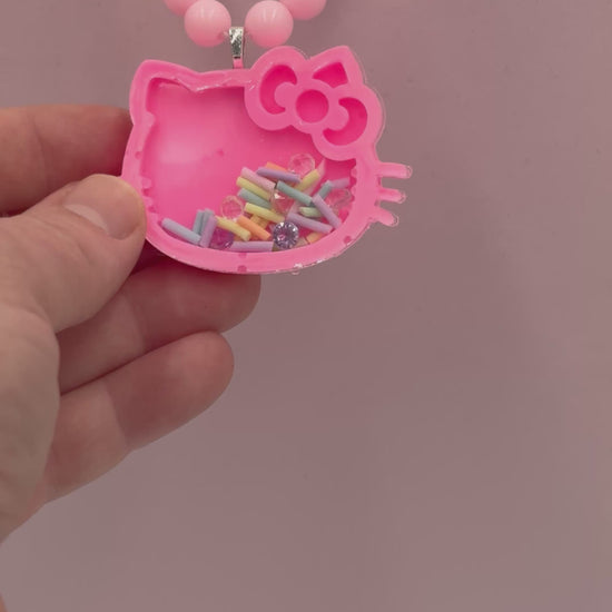 Pink Kawaii Kitty shaker necklace, that glows in the dark, filled with sprinkles and rhinestones.