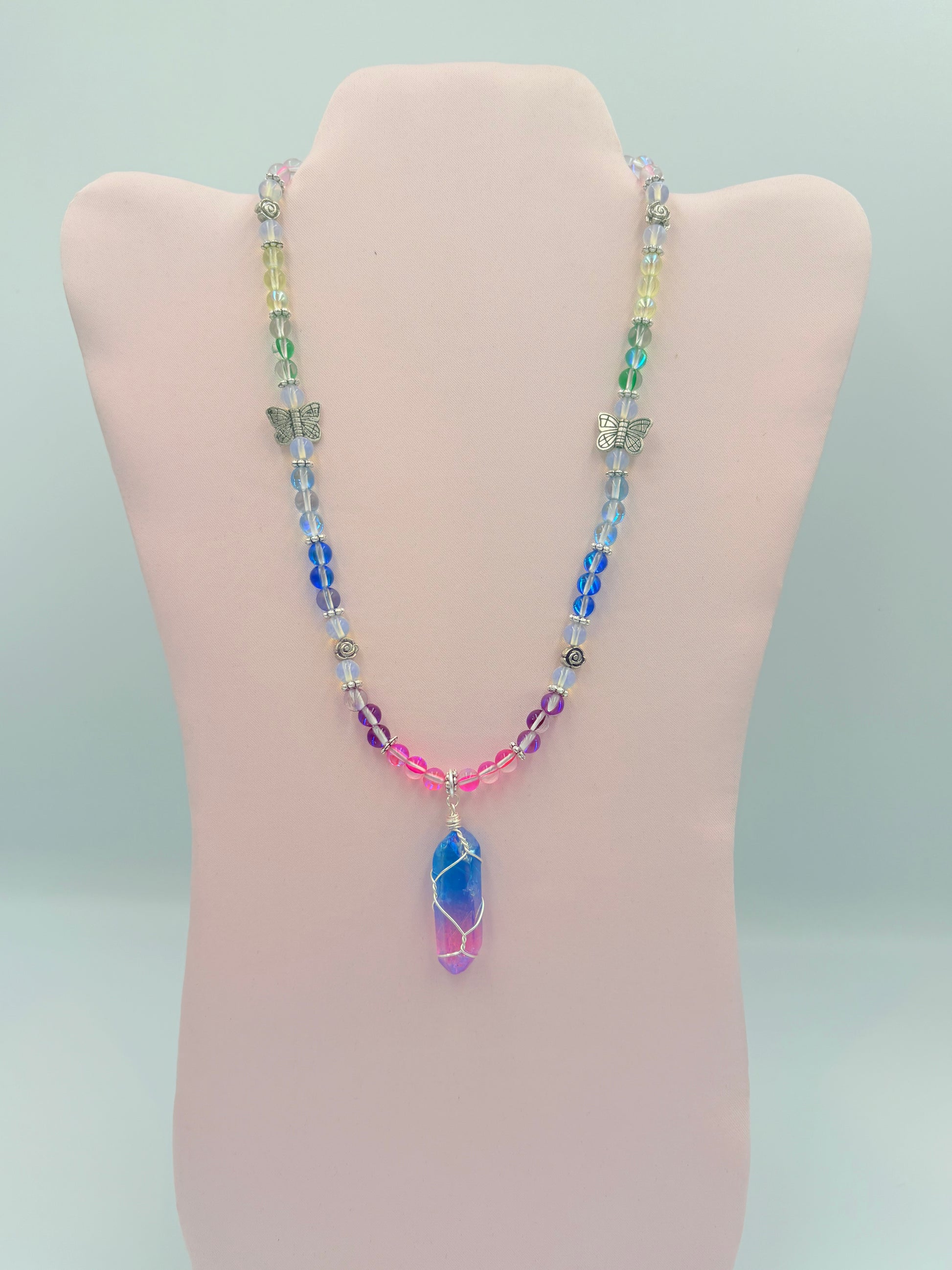Rainbow Aura Quartz Necklace with hand-wrapped cotton candy aura quartz point with pewter butterflies and rose accents.